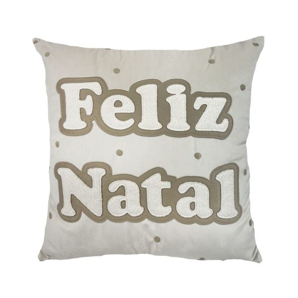 Almofada “Feliz Natal” em Veludo Off-White | com Aplicação Bege – 45X45cm
