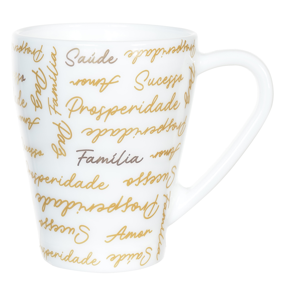 Caneca em Vidro Opalino Desejos – 350ml | Dourado e Branco – 12x9cm