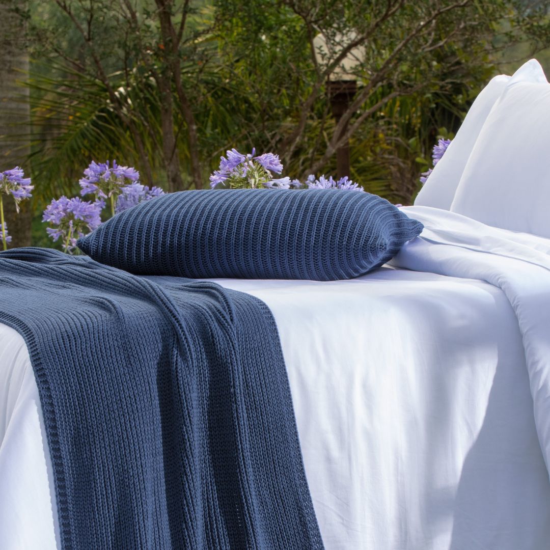 O trançado delicado em tricô oferece textura e suavidade, enquanto o tom azul marinho — clássico e versátil — é perfeito para composições que valorizam harmonia e sobriedade. Ideal para destacar em ambientes neutros ou compor com paletas que exploram contrastes sofisticados, essa peça imprime autenticidade e estilo à cama, sofá ou poltrona.