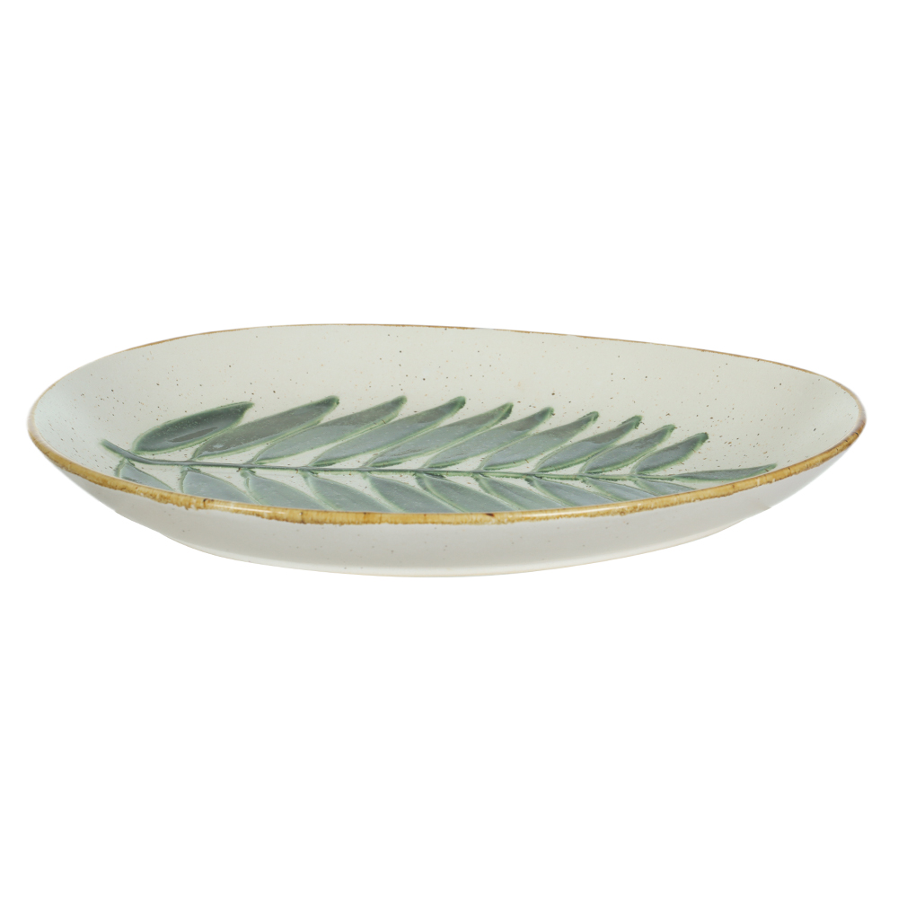 Produzido em cerâmica de alta qualidade, apresenta design em formato de folha com acabamento em off-white e detalhes em verde, criando um visual harmonioso e sofisticado. A combinação das cores suaves com o tema natural proporciona frescor e delicadeza ao ambiente.
