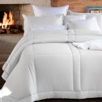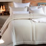 Confeccionado em tecido de 300 fios, oferece toque extremamente macio, com leve brilho acetinado e excelente respirabilidade, garantindo conforto térmico em todas as estações. Seu enchimento proporciona volume equilibrado, resultando em um caimento amplo e elegante sobre a cama.
