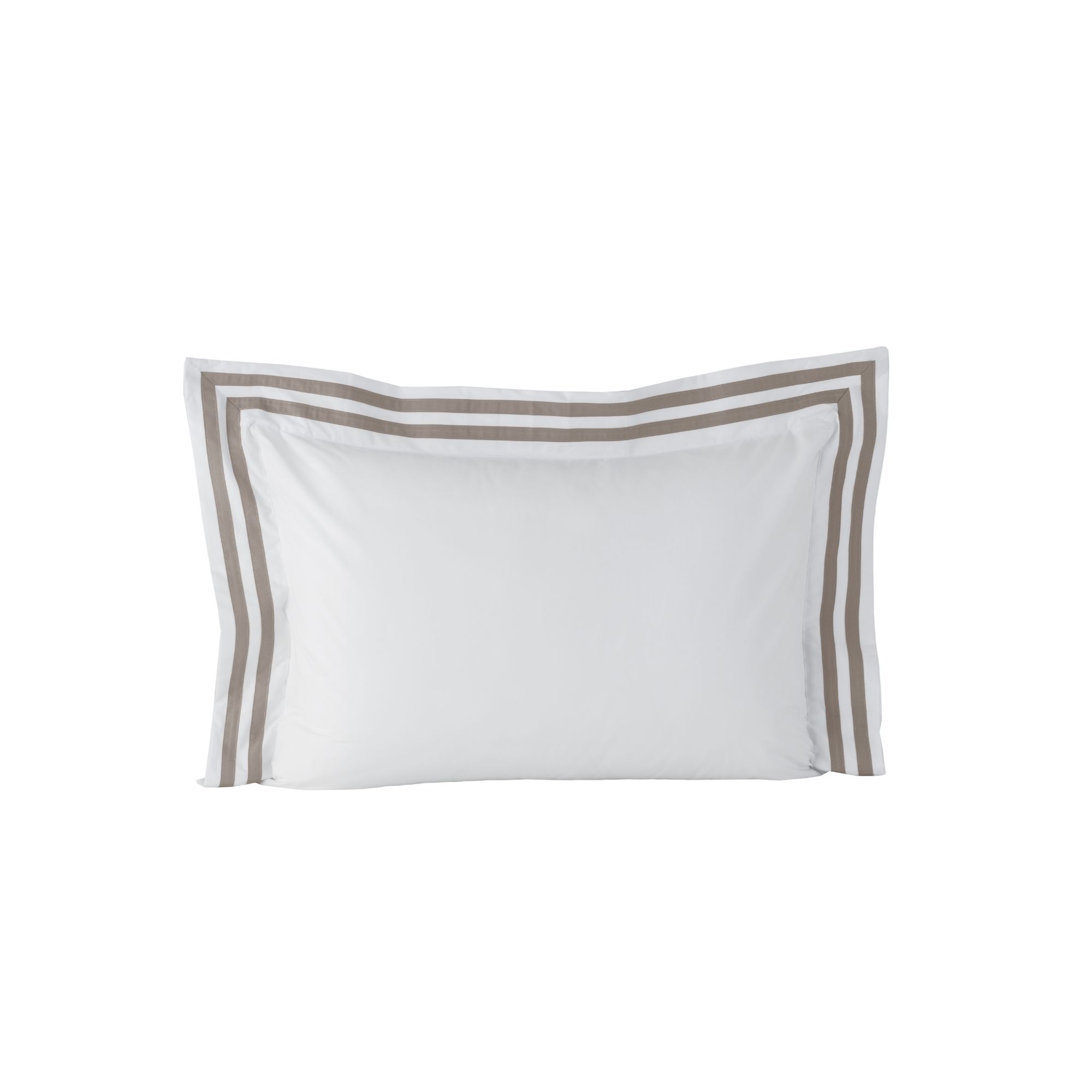 A fronha avulsa Duale combina o branco sofisticado com filetes na cor amêndoa, criando um visual suave, elegante e atemporal que valoriza a composição da cama com harmonia e sutileza.