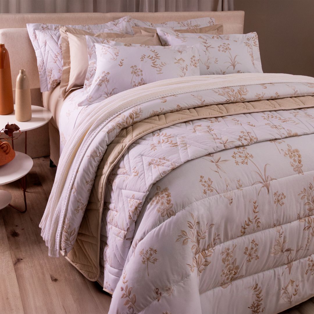 O detalhe em vira valoriza a estampa Toscana, trazendo um acabamento refinado e sofisticado para a arrumação da cama.