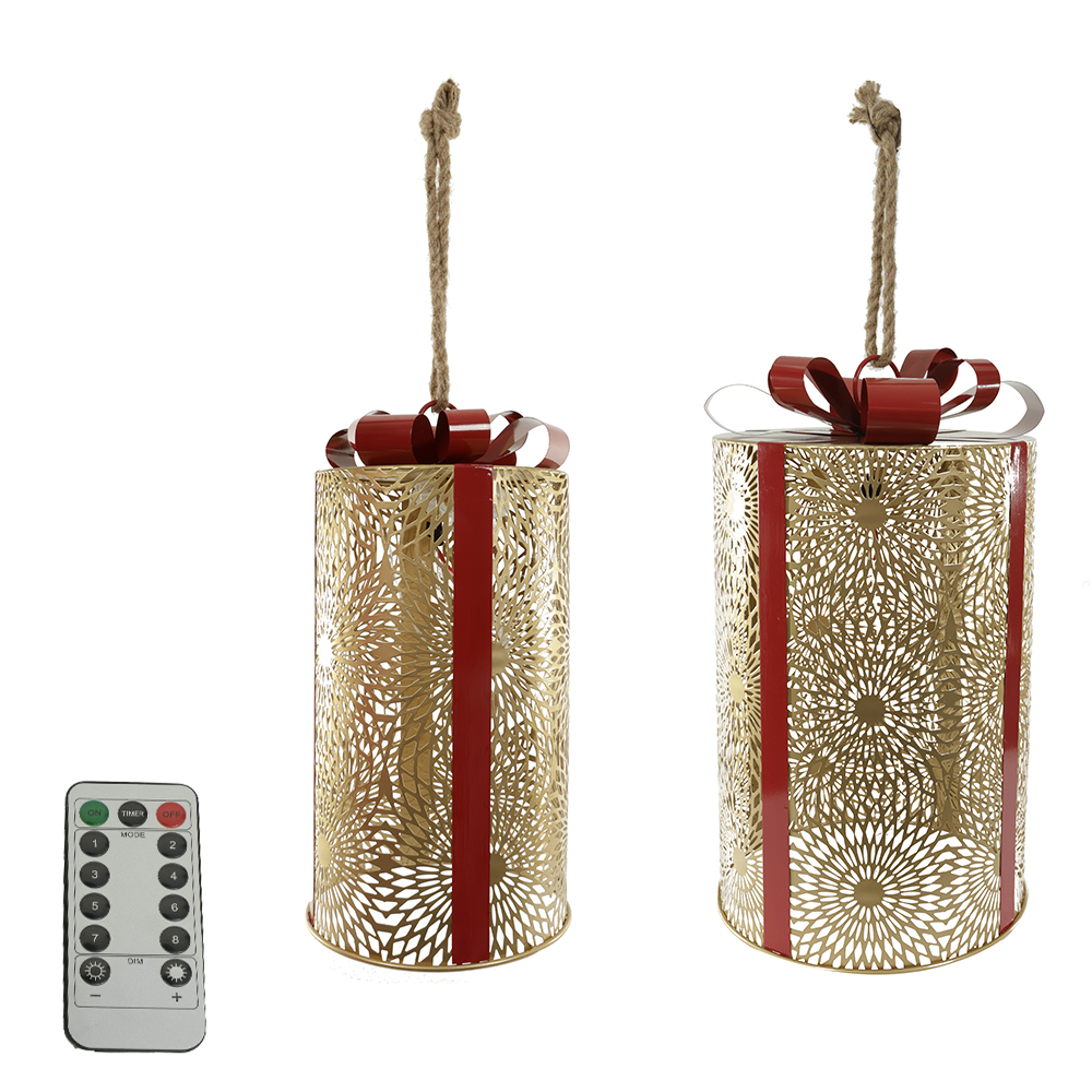 Decore sua casa com charme e brilho utilizando o Kit 2 Presentes Luminária em Metal. Com cores dourado e vermelho, essas peças iluminadas trazem um toque festivo e sofisticado para sua decoração natalina.