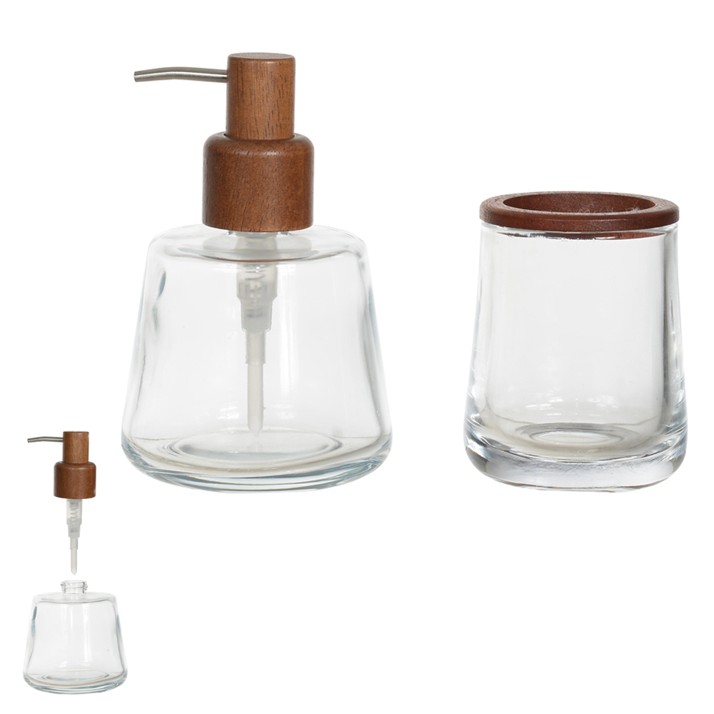 Kit para Banheiro | Vidro Transparente e Madeira Acácia | 2 Peças – 350ml