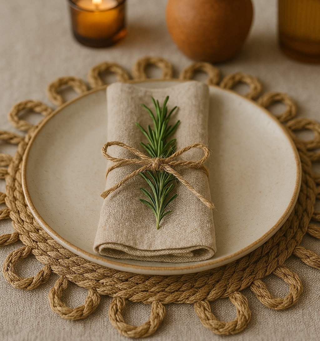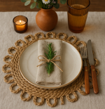 Esse lugar americano redondo é feito em fibra natural trançada, com acabamento em delicados laços ao redor que trazem um toque orgânico e elegante para qualquer refeição. Ideal para composições que valorizam o natural, o artesanal e o aconchego, ele combina perfeitamente com decorações rústicas, boho ou minimalistas.