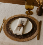 Dê um toque rústico e elegante à sua mesa com o Lugar Americano em Fibra de Papel com Juta e Fendas. Com acabamento diferenciado e textura natural, ele é perfeito para composições sofisticadas e acolhedoras. Sua cor marrom neutra combina facilmente com diferentes estilos de louças e decorações.