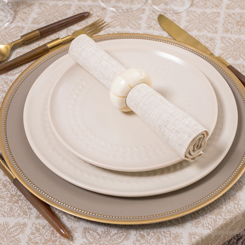 A linha Intreccio se destaca pelo seu design detalhado e acabamento refinado, que agrega textura e personalidade à peça. Na tonalidade Yvory, transmite leveza e versatilidade, combinando facilmente com diferentes estilos de mesa — do clássico ao contemporâneo.
