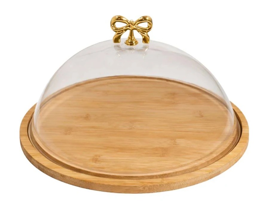 Prato para Bolo com Base em Bambu e Tampa em PS | Laço Dourado – D32 x A12 cm