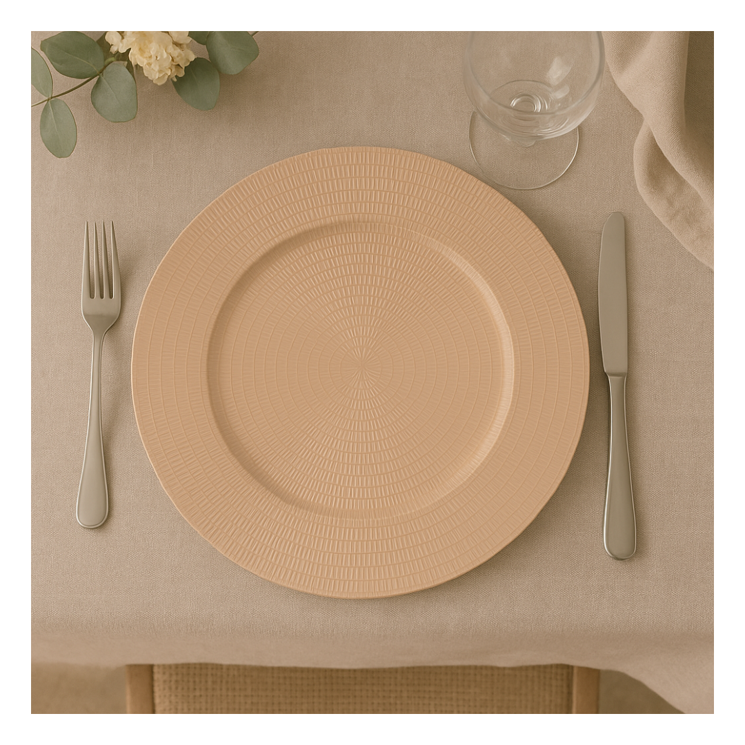 Clássico e sofisticado, o Sousplat Polipropileno Textura na cor bege é perfeito para composições neutras, elegantes e acolhedoras. Com 33 cm de diâmetro, ele valoriza a apresentação dos pratos e traz equilíbrio à mesa posta, seja em ocasiões formais ou no dia a dia com estilo.