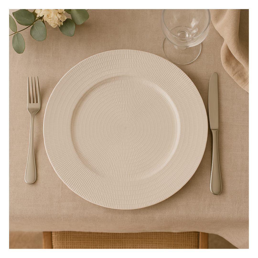 Fabricado em polipropileno resistente, é leve, durável e fácil de limpar — ideal tanto para o uso diário quanto para receber com charme. Seu design com leve relevo traz um toque de naturalidade, enquanto a cor neutra permite inúmeras combinações com louças e acessórios de diferentes estilos.